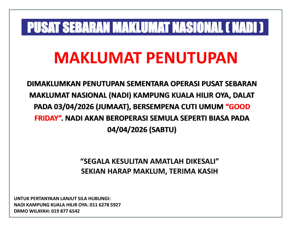 Dimaklumkan bahawa NADI Kampung Kuala Hilir Oya akan ditutup sementara sempena sambutan Good Friday pada tarikh seperti berikut: